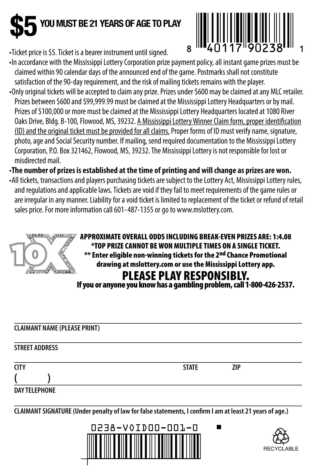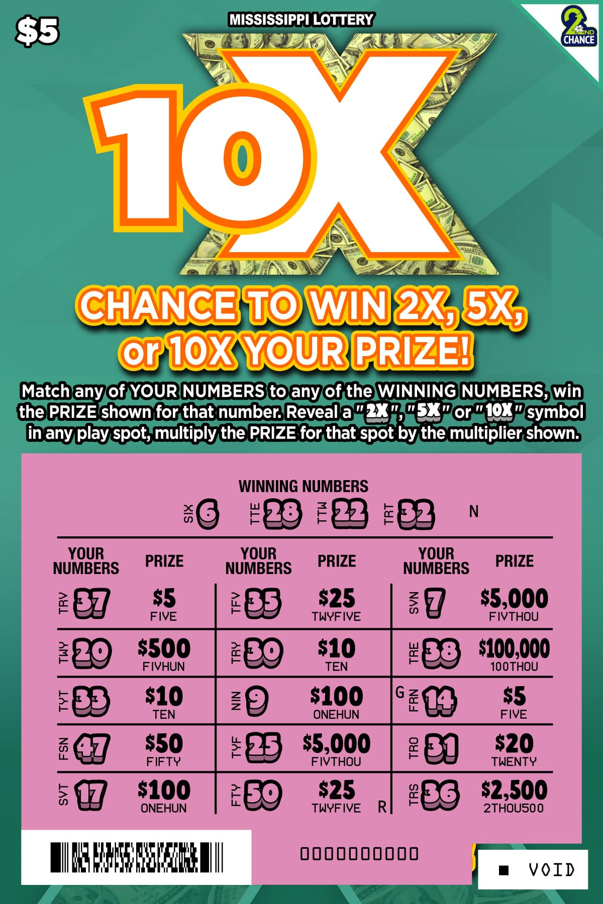 Match any of YOUR NUMBERS to any of the WINNING NUMBERS, win the PRIZE shown for that number. Reveal a “2X”, “5X” or “10X” symbol in any play spot, multiply the PRIZE for that spot by the multiplier shown.