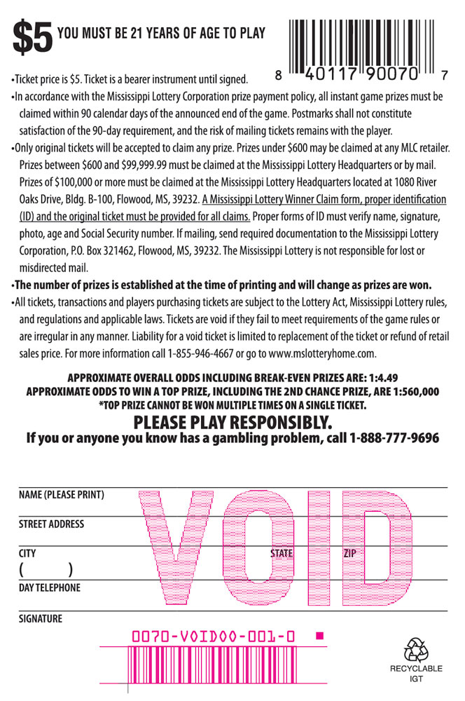 | * Approximate overall odds of winning including breakeven prizes is established at the time of printing. Chances of winning will change as prizes are won. | |