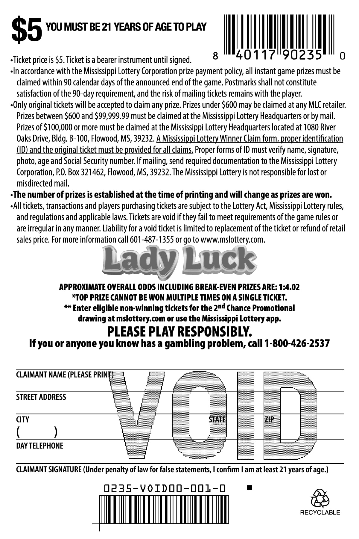 | * Approximate overall odds of winning including breakeven prizes is established at the time of printing. Chances of winning will change as prizes are won. | |
