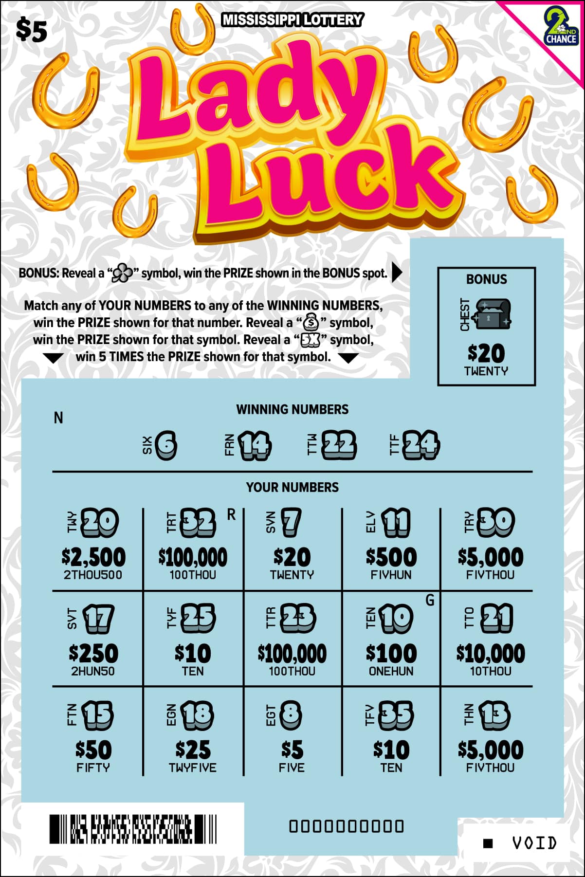 Match any of YOUR NUMBERS to any of the WINNING NUMBERS, win the PRIZE shown for that number. Reveal a moneybag symbol, win the PRIZE shown for that symbol. Reveal a 5X symbol, win 5 TIMES the PRIZE shown for that symbol.