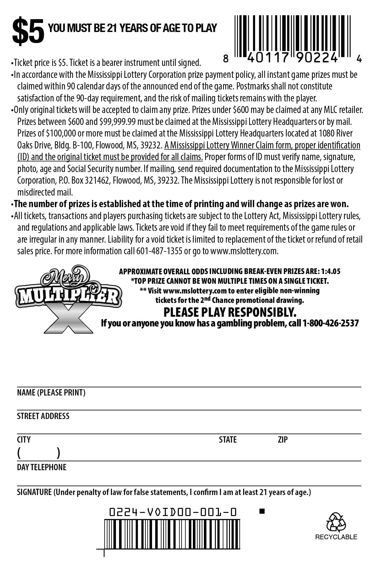 | * Approximate overall odds of winning including breakeven prizes is established at the time of printing. Chances of winning will change as prizes are won. | |