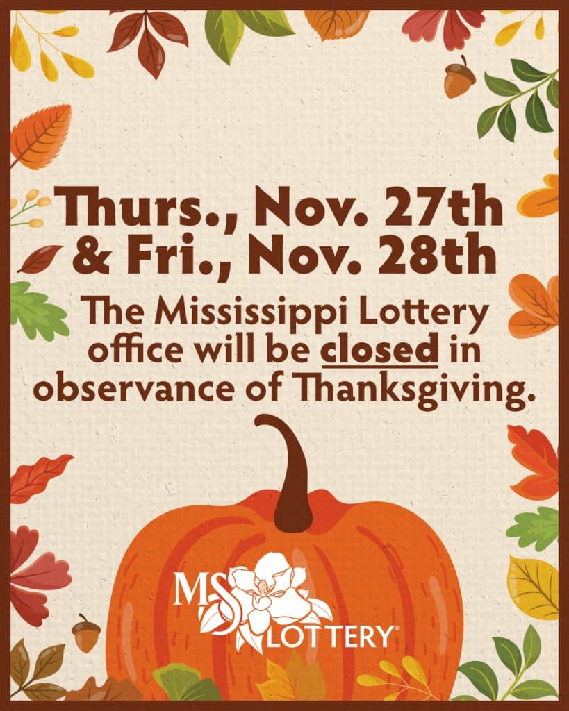 Every effort is made to ensure the accuracy of information contained on this website. This website, however, is not the final authority on winning numbers, prizes, games, or other information. Winning numbers are not official until validated by the Mississippi Lottery and its independent auditors. All winning tickets must be validated by the Mississippi Lottery before prizes will be paid.