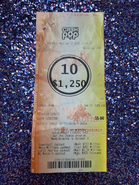 A Byram player won $1,250 on a Cash Pop ticket from Walmart Superstore #2720 in Madison.
