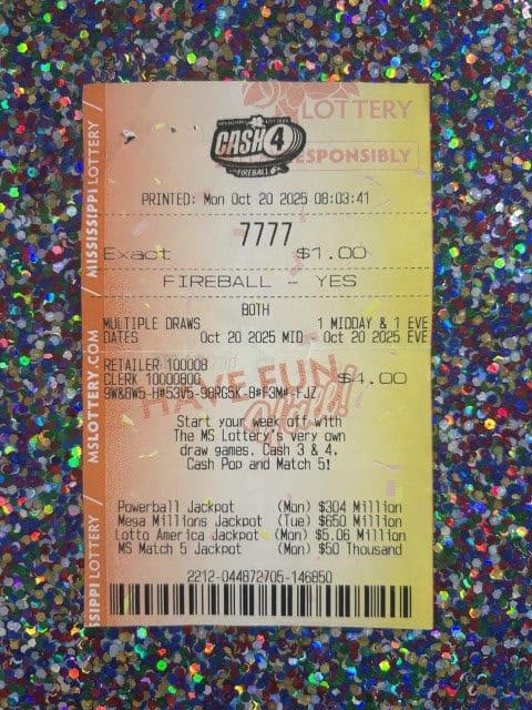 Every effort is made to ensure the accuracy of information contained on this website. This website, however, is not the final authority on winning numbers, prizes, games, or other information. Winning numbers are not official until validated by the Mississippi Lottery and its independent auditors. All winning tickets must be validated by the Mississippi Lottery before prizes will be paid.
