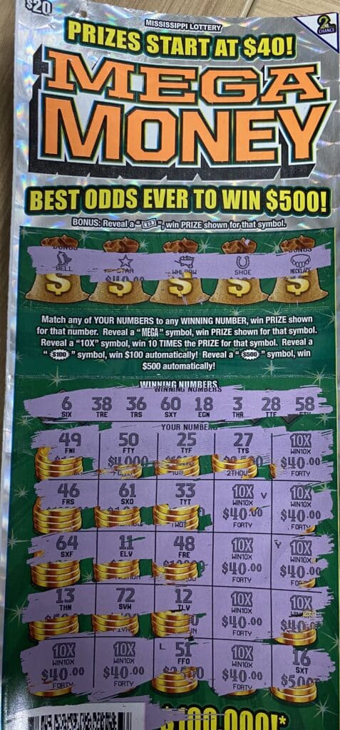 A Hattiesburg woman won $4,000 on a $20 Mega Money scratch-off game purchased from Olde Town Station on W. Jackson St., Ridgeland.