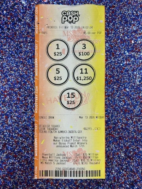 A Hazlehurst woman won $1,250 on a Cash Pop ticket from Sweet Pea’s 76 in Hazlehurst.