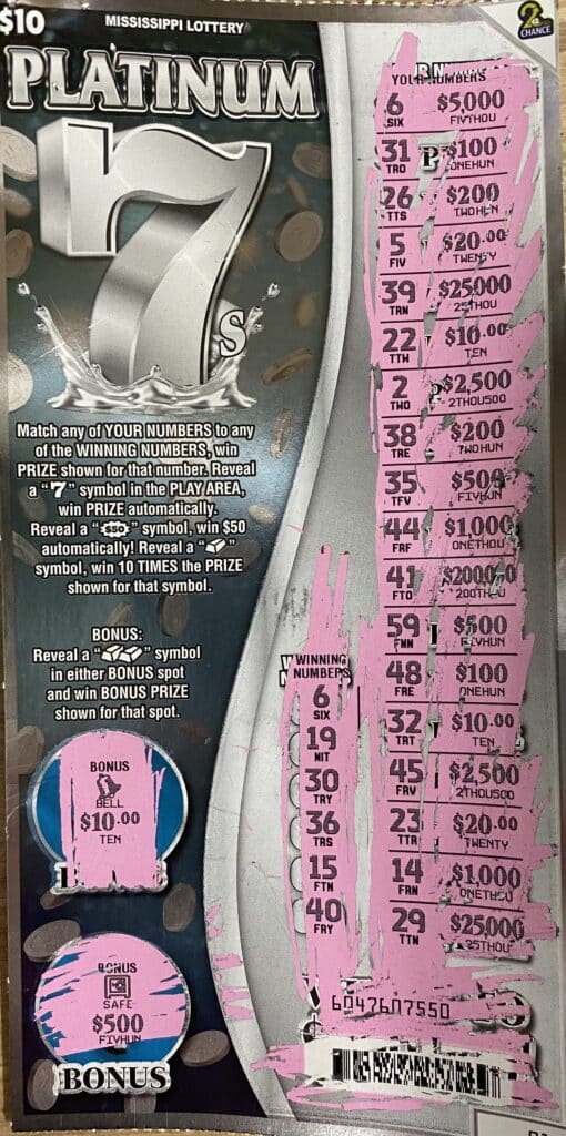 A Lee County man won $5,000 on a $10 Platinum 7s scratch-off game purchased from TNT Main Stop on Main St., Plantersville.
