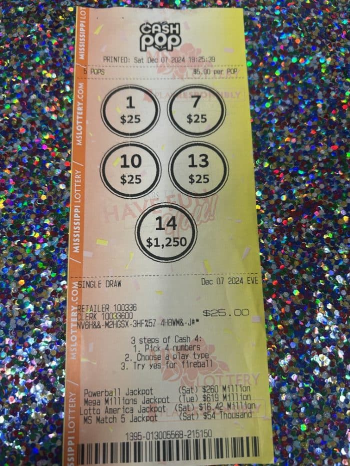A Louisville man won $1,250 on a Cash Pop ticket from Gregory Food Mart in Louisville.