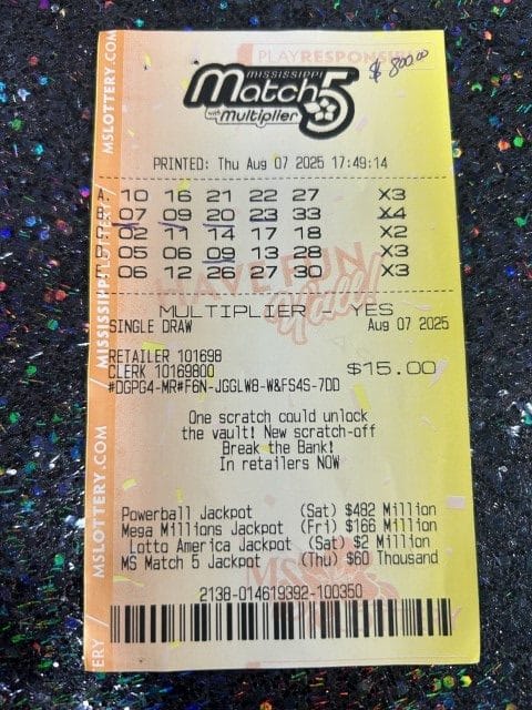 A Natchez man won $800 on a Match 5 ticket from 61 Hill Food & Fuel in Natchez.