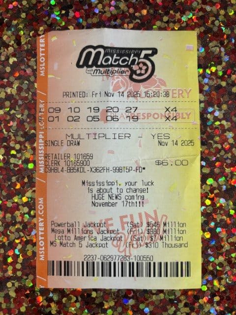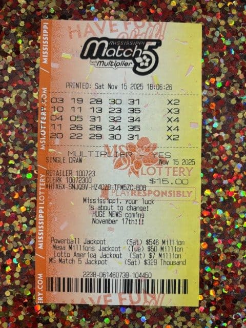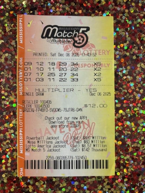 A Pascagoula man won $808 on a Match 5 ticket from Shell Food Mart in Moss Point.
