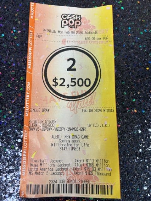 A Pearl woman won $2,500 on a Cash Pop ticket from Circle K Store #2723440 in Pearl.