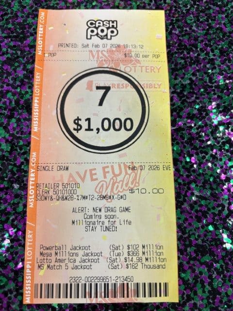 A Prairie man won $1,000 on a Cash Pop ticket from Sprint Mart #39 in Tupelo.