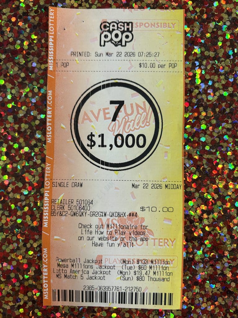 A Starkville man won $1,000 on a Cash Pop ticket from Sprint Mart #4126 in Starkville.