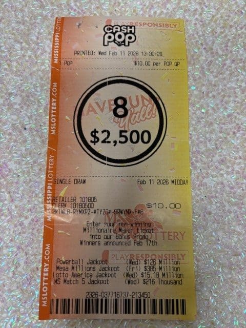 A Starkville woman won $2,500 on a Cash Pop ticket from Ezy Go Deli in Starkville.