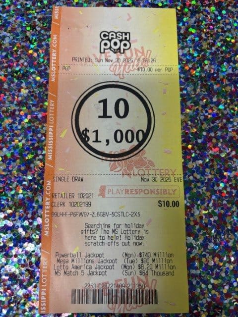 A Terry man won $1,000 on a Cash Pop ticket from Brando’s Tobacco Store in Byram.