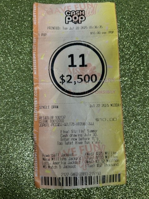 A Tupelo man won $2,500 on a Cash Pop ticket from Dixie Mart in Ackerman.