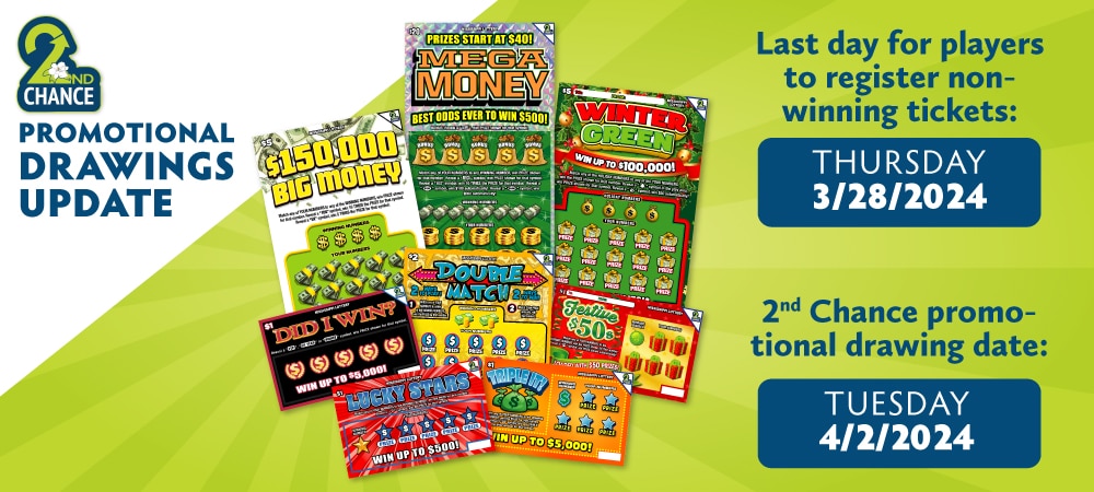 Spring 2nd Chance promotional drawing giving away more than $375,000 in prizes JACKSON, MISS. – Today is the last date for players to register non-winning tickets for an additional chance to win a top prize on eight ending scratch-off games. Today is also the last day for players to redeem any valid prizes for these… Continue reading Reminder: 2nd Chance Promotional Drawing April 2