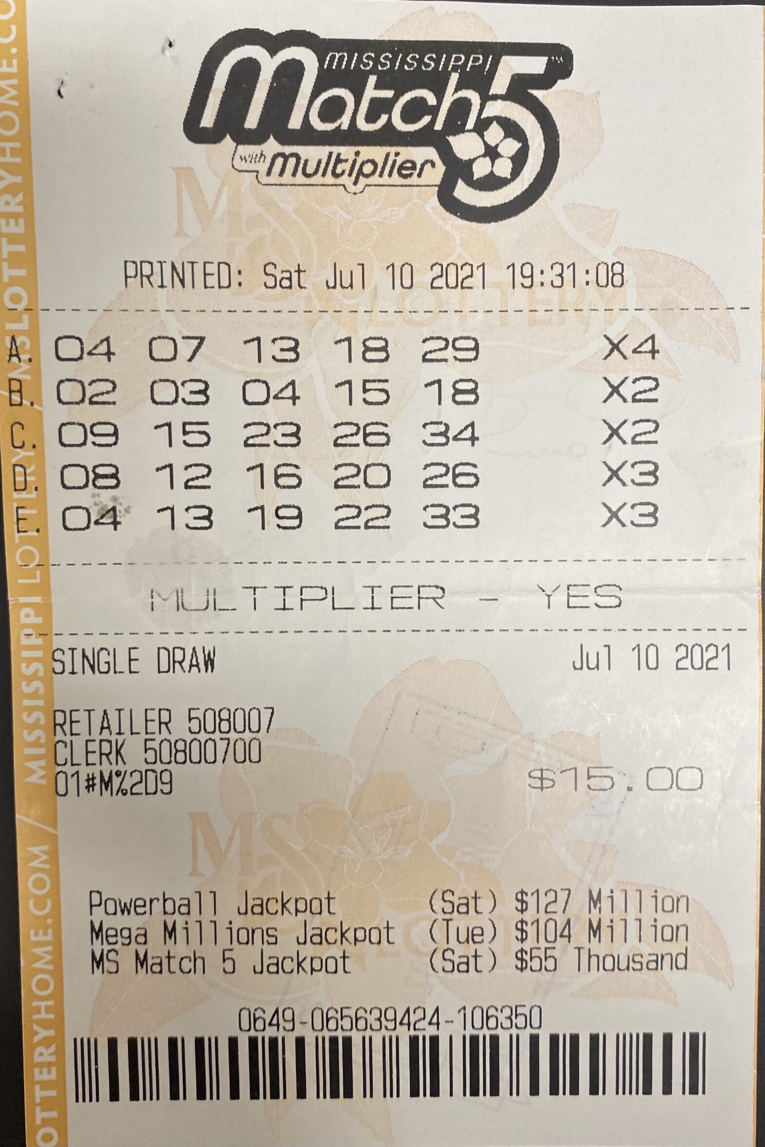 Mega Millions® Tuesday night jackpot reaches $153 million; Powerball® Wednesday night jackpot grows to $186 million JACKSON, MISS. –Having never played Mississippi Match 5, a Pass Christian player decided to try her luck on the Mississippi Match 5 July 15 drawing, which boasted an $85,000 jackpot. She visited headquarters today to claim her prize. C… Continue reading $85,000 Mississippi Match 5 Winner Claims Prize!