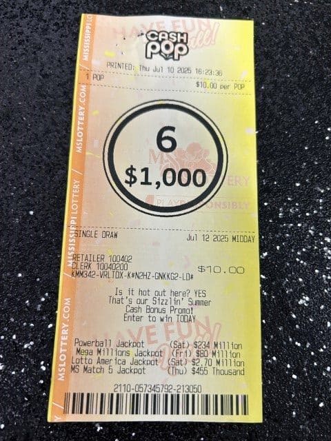 A Bay Springs man won $1,000 on a Cash Pop ticket from Keith’s Superstore #117 in Bay Springs.