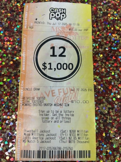 A Brandon woman won $1,000 on a Cash Pop ticket from Me Gas & Food in Crystal Springs.