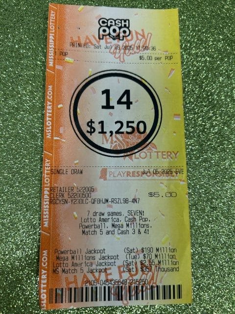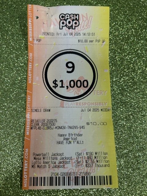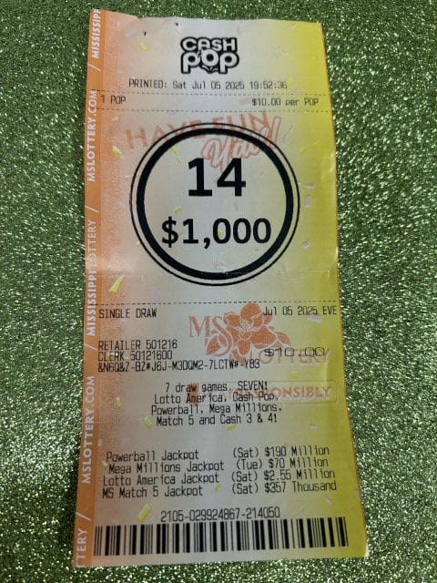 A Chunky man won $1,000 on a Cash Pop ticket from Shell Food Mart #22 in Meridian.