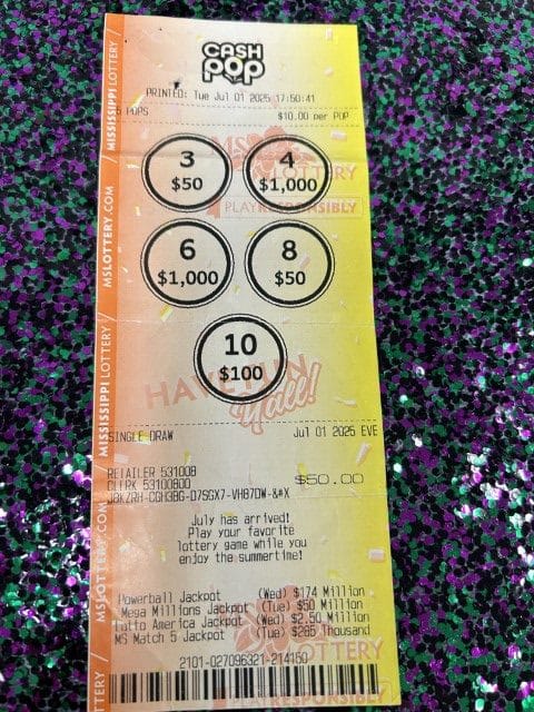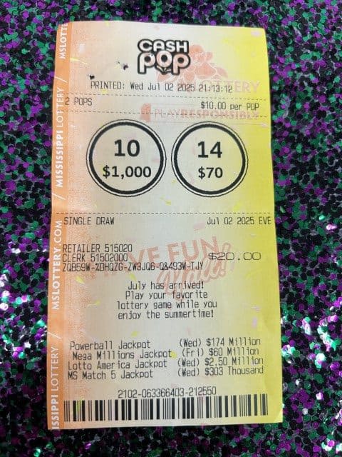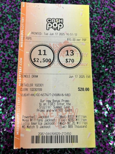 A Starkville woman won $2,500 on a Cash Pop ticket from Down The Hatch in Starkville.