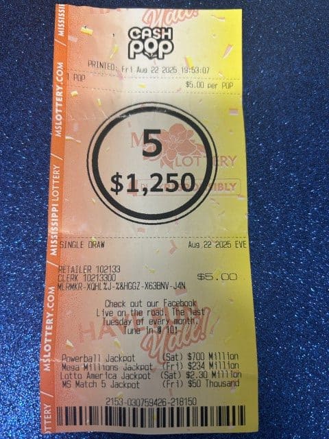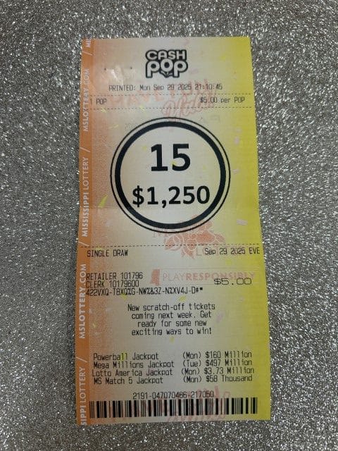 A Hattiesburg woman won $1,250 on a Cash Pop ticket from Hh Discount Tobacco & Beer in Hattiesburg.