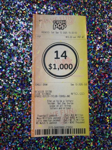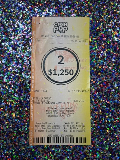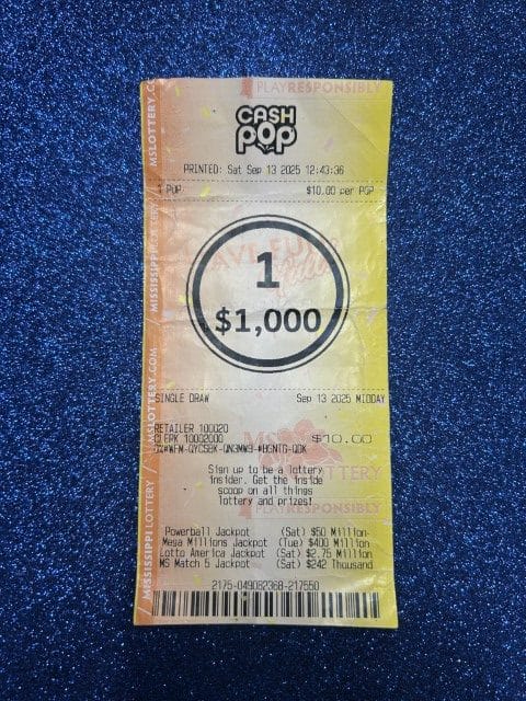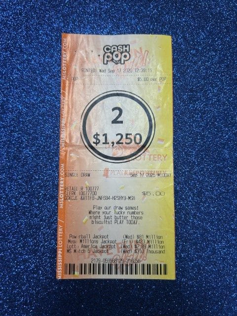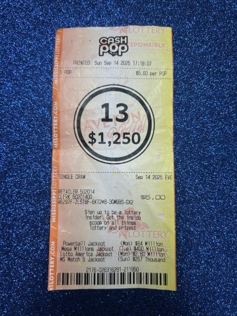 A Scooba woman won $1,250 on a Cash Pop ticket from Sprint Mart #4144 in Columbus.