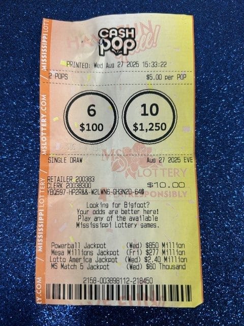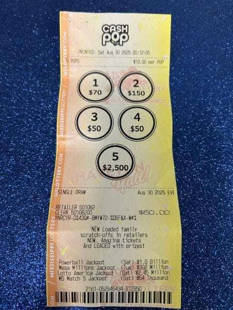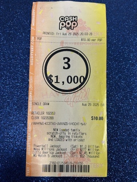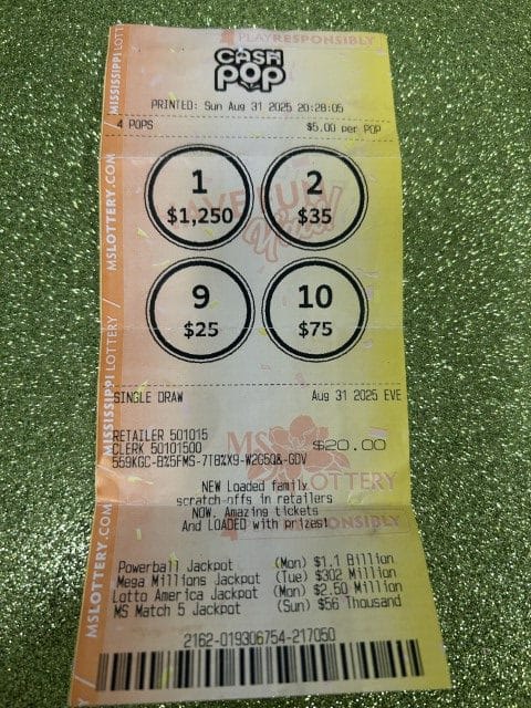 A Byram player won $1,250 on a Cash Pop ticket from Walmart Superstore #2720 in Madison.