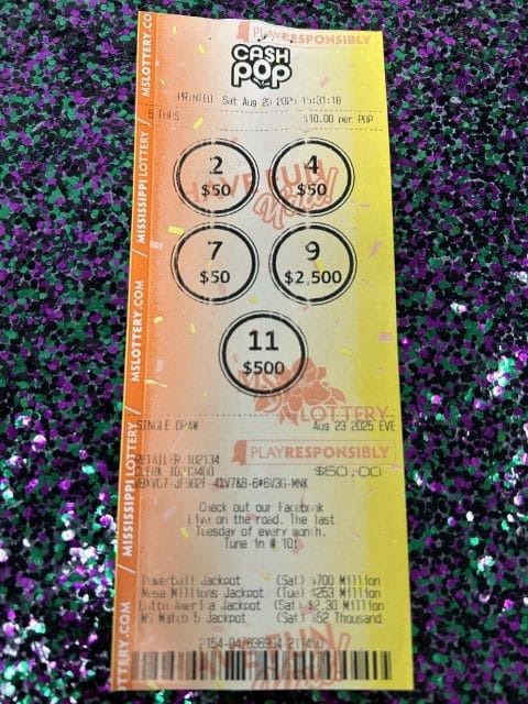 A Wiggins woman won $2,500 on a Cash Pop ticket from Jr Food Mart #473 in Lucedale.