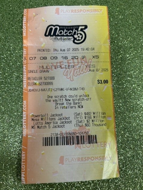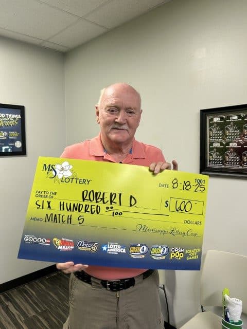 A Hickory Flat man won $600 on a Match 5 ticket from Tobacco Warehouse #46 in Ripley.