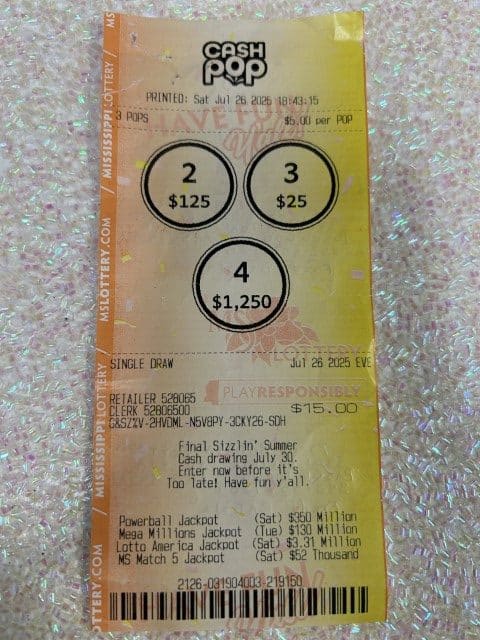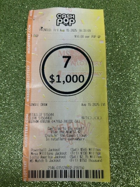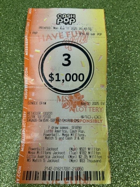 A Pascagoula man won $1,250 on a Cash Pop ticket from Walmart Superstore #1066 in Pascagoula.