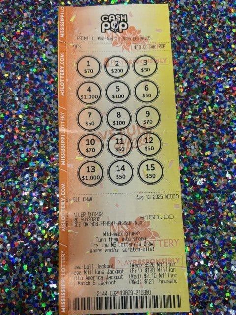 A Meridian woman won $1,000 on a Cash Pop ticket from Shell Food Mart #9 in Marion.