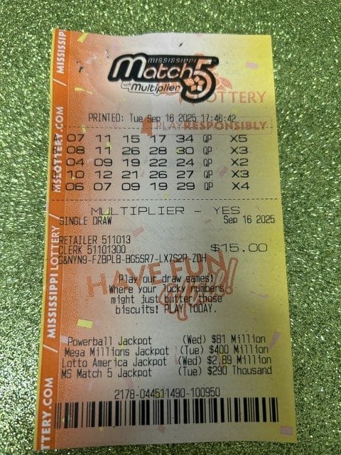 A Theodore, AL man won $1,000 on a Match 5 ticket from Keith’s Superstore #86 in Moss Point.