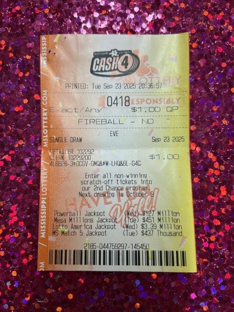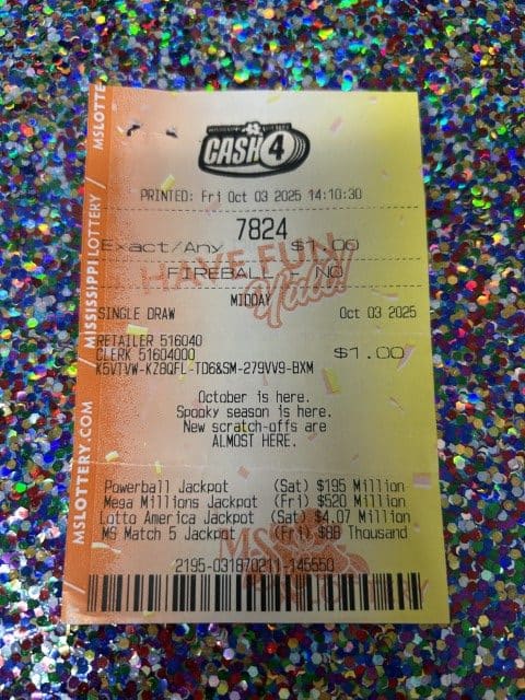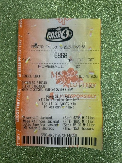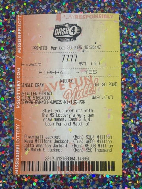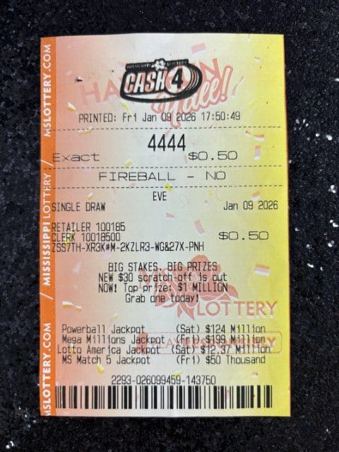 A Hattiesburg man won $2,600 on a Cash 4 ticket from Murphy Oil Usa #8503 in Petal.