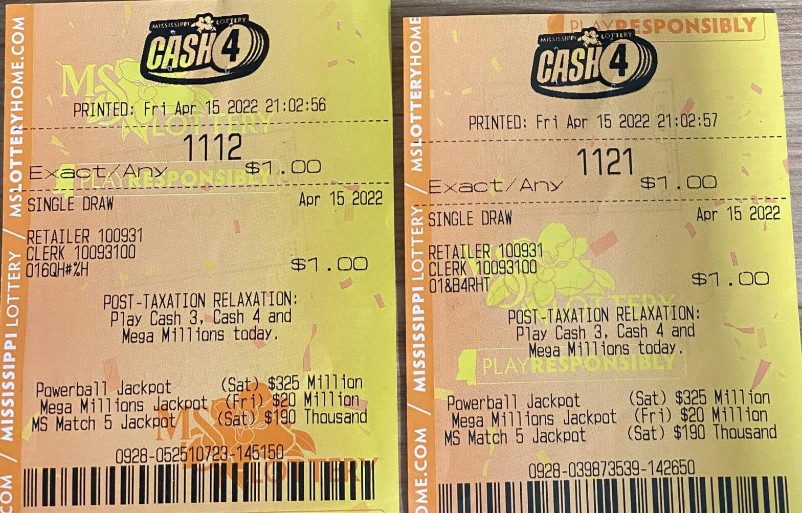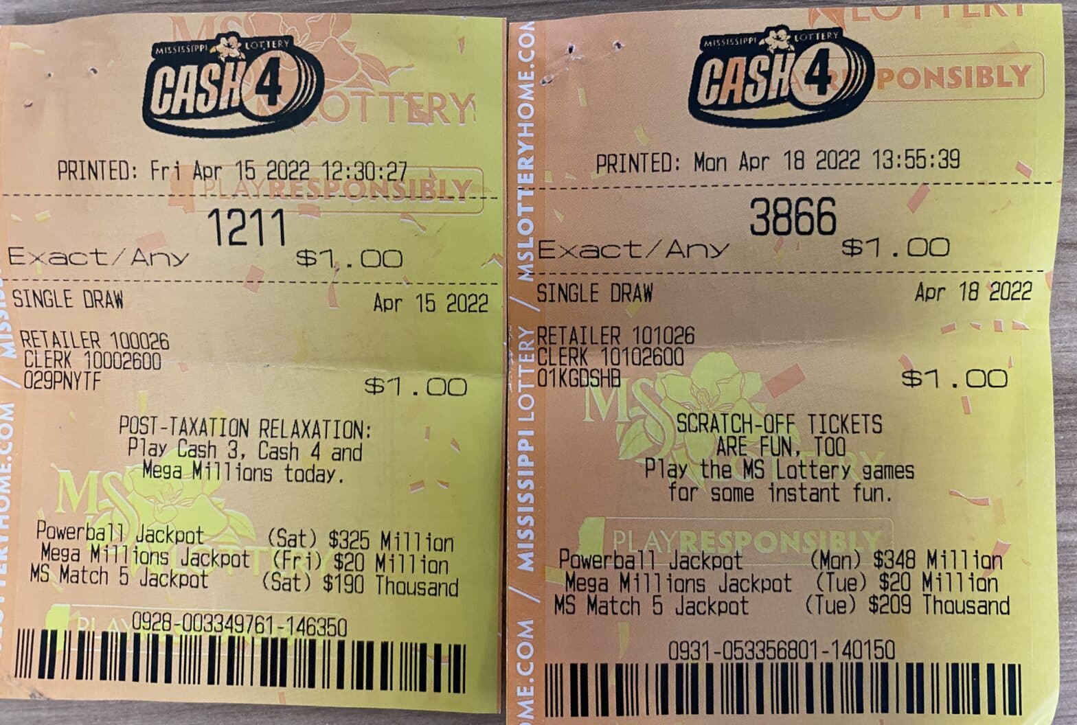 A Vicksburg woman won $1,200 on two Cash 4 tickets purchased from Shell Food Mart on Hwy. 61 South, Vicksburg.