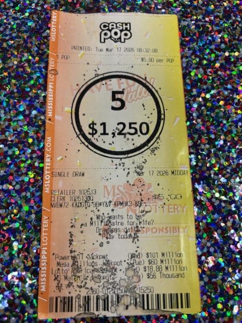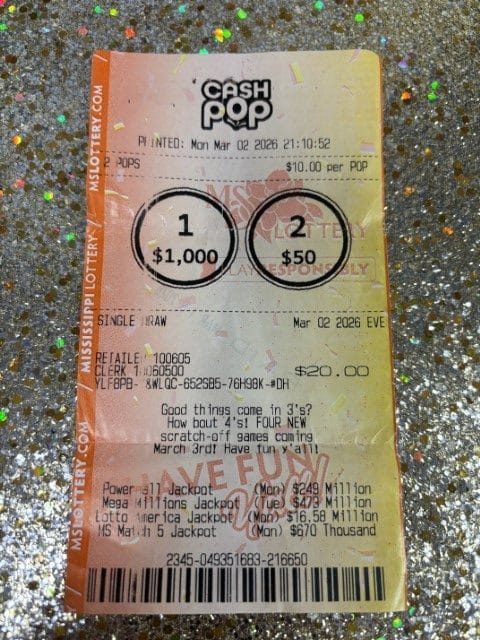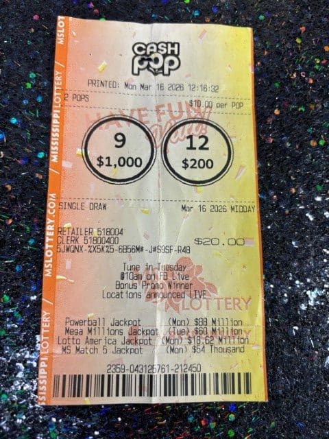 A Pheba man won $1,250 on a Cash Pop ticket from Walmart Fuel Station #5459 in Starkville.