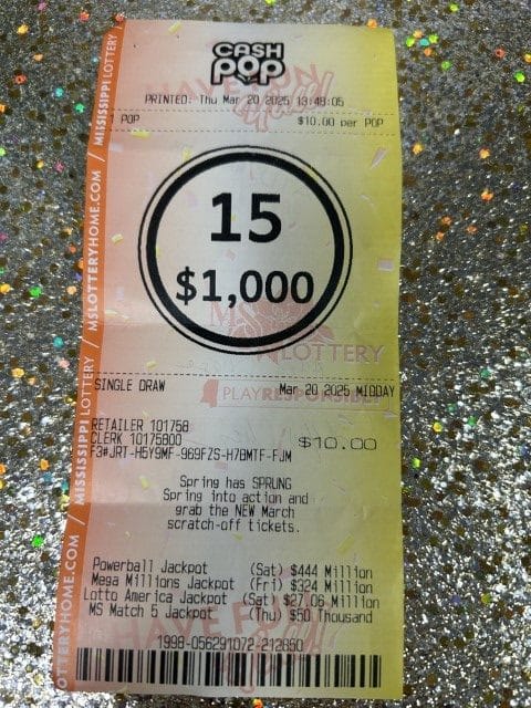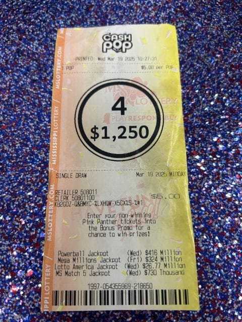 A Lucedale man won $1,250 on a Cash Pop ticket from Jr Food Mart #473 in Lucedale.