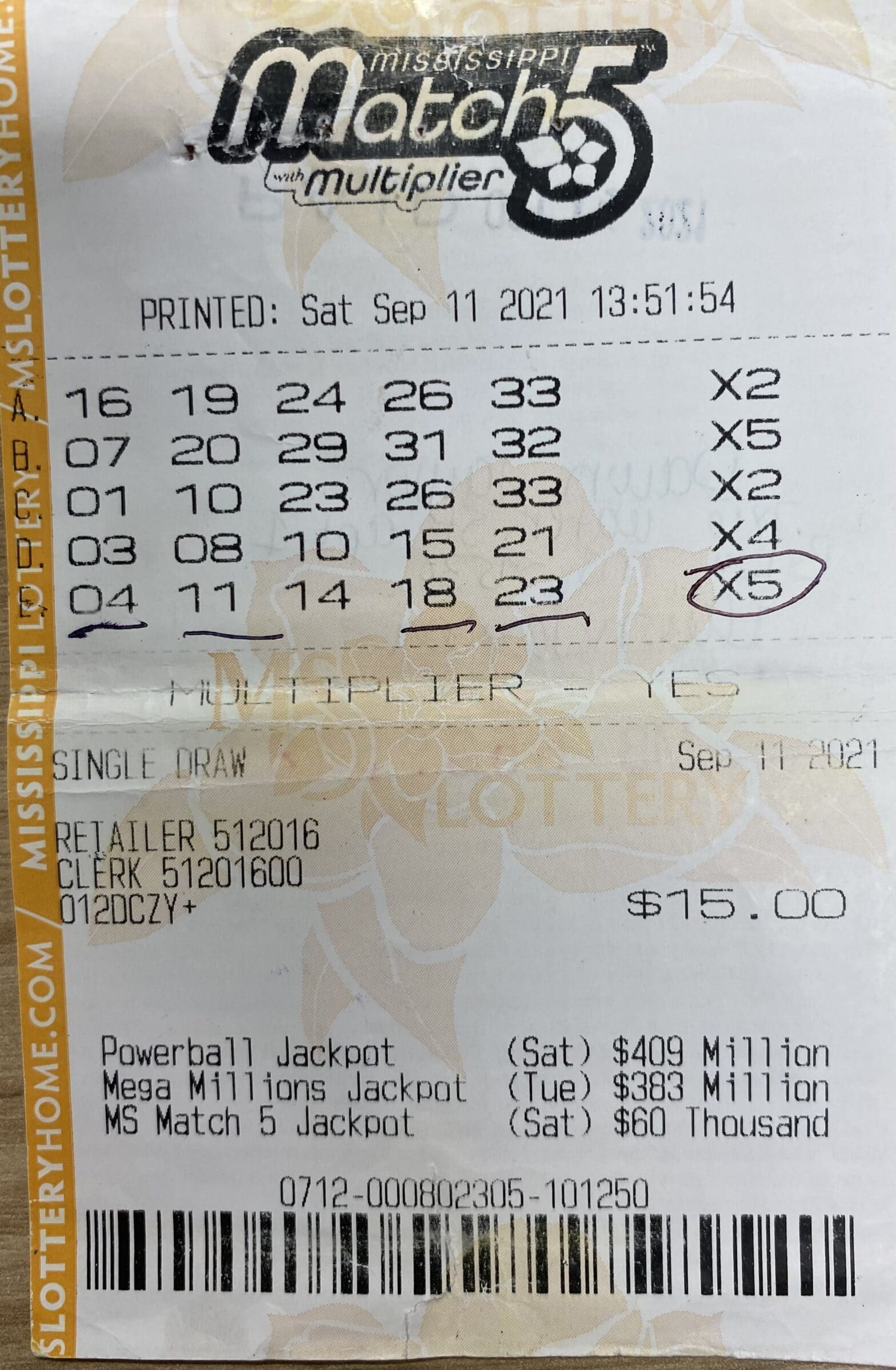 A Woodville man won $800 on a Mississippi Match 5 ticket purchased from Murphy Oil USA #7746 on Sergeant S. Prentiss Dr., Natchez.
