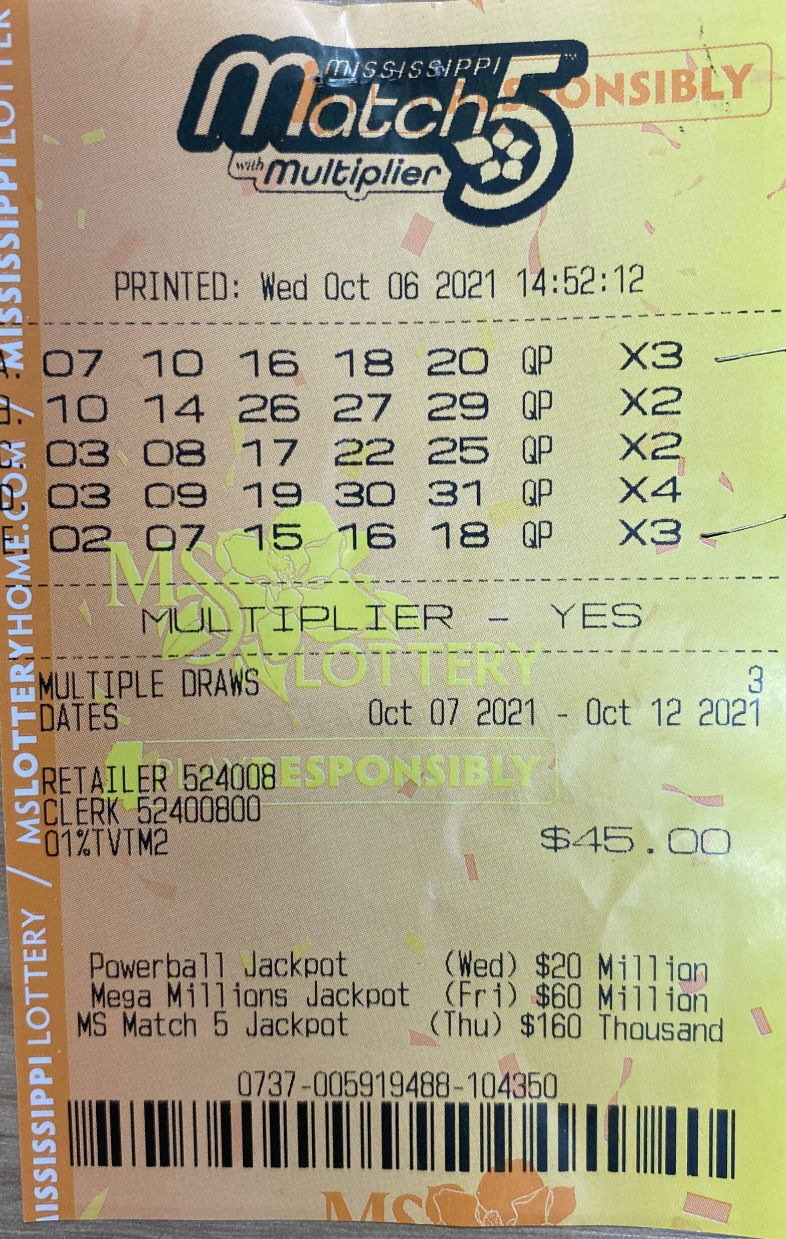 A Hattiesburg man won $800 on a Mississippi Match 5 ticket purchased from Fuel Time 16 LLC on Hardy St., Hattiesburg.