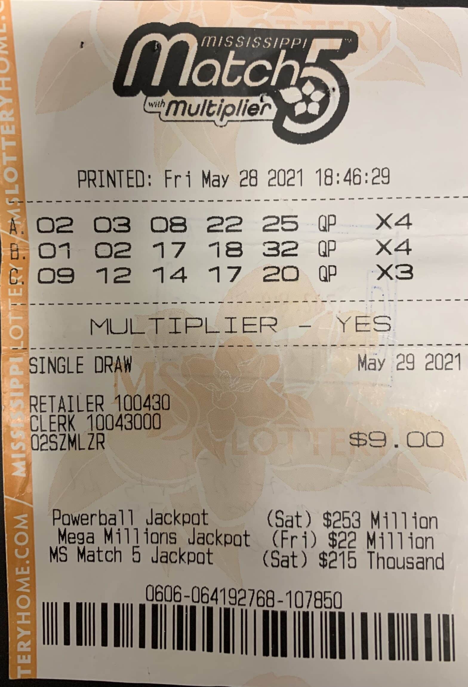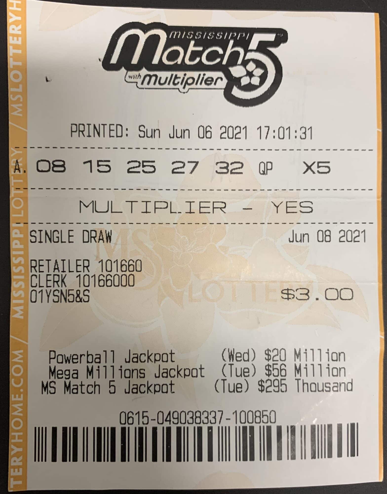 A Vicksburg man won $1,000 on a Mississippi Match 5 ticket purchased from Quick Mart on Washington St., Vicksburg.