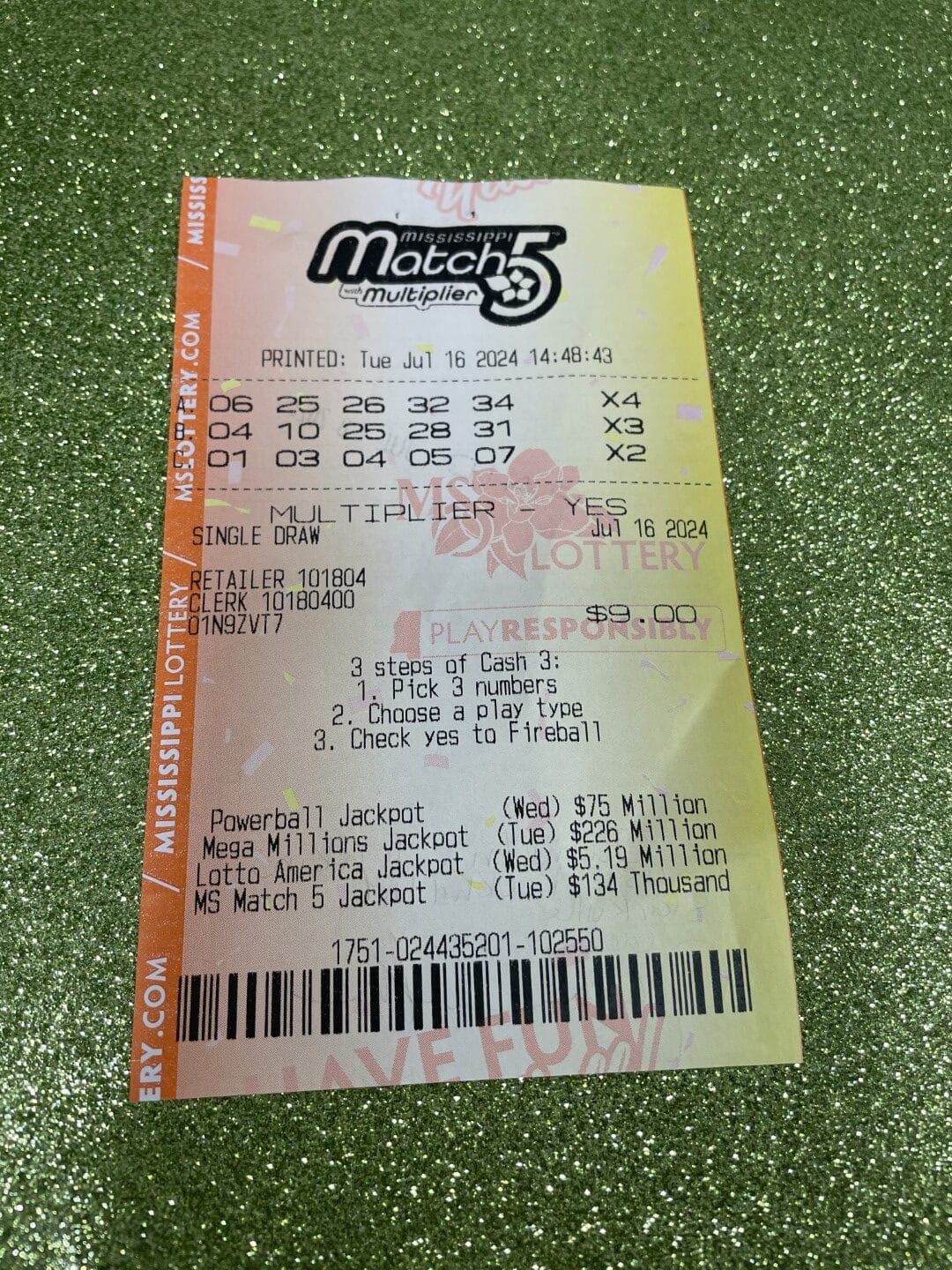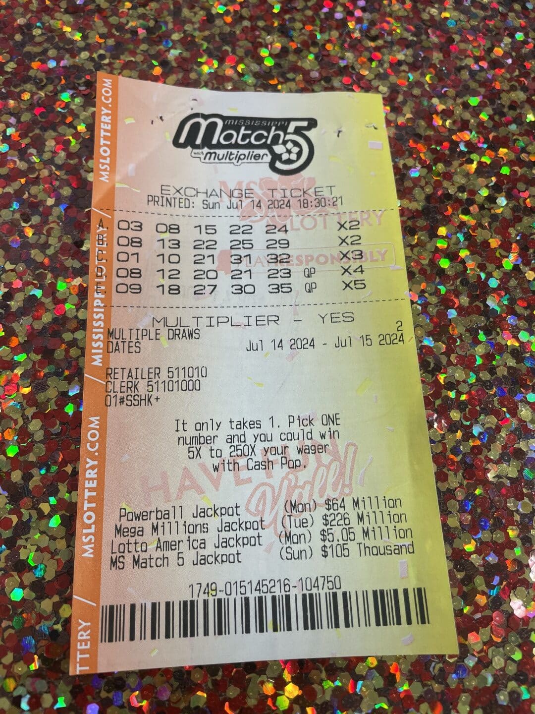 A Sumrall man won $800 on a Match 5 ticket from Ramey’s in Sumrall.