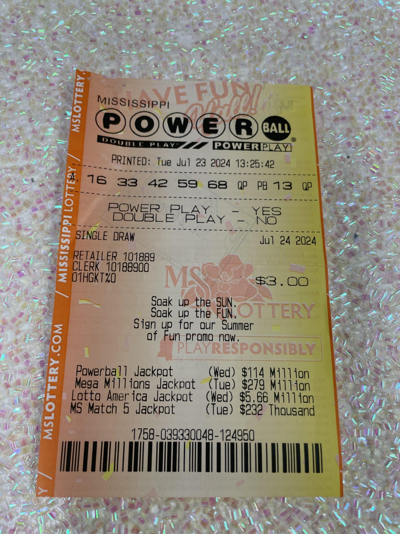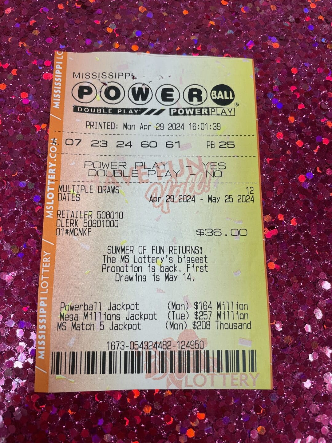 A Tupelo woman won $100,000 from the July 24 drawing. She purchased her winning Powerball ticket from Marathon Fast Stop in Tupelo. Normally, she chooses her own numbers. However, she decided for the Quick Pick option and is very thankful she did.