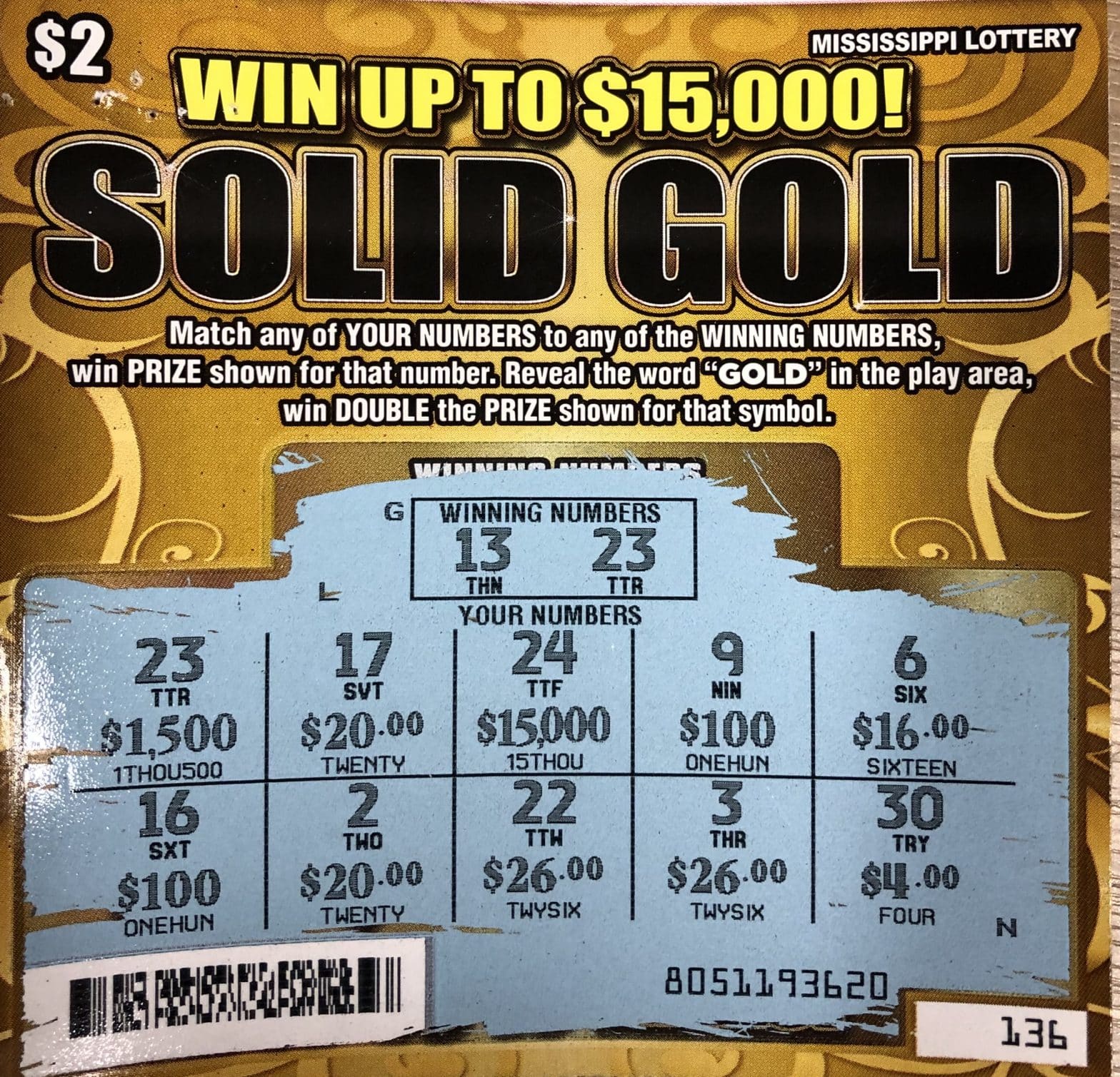 A Terry man won $1,500 on a Solid Gold scratch-off game purchased at Pit Stop on Cunningham Ave., Terry.
